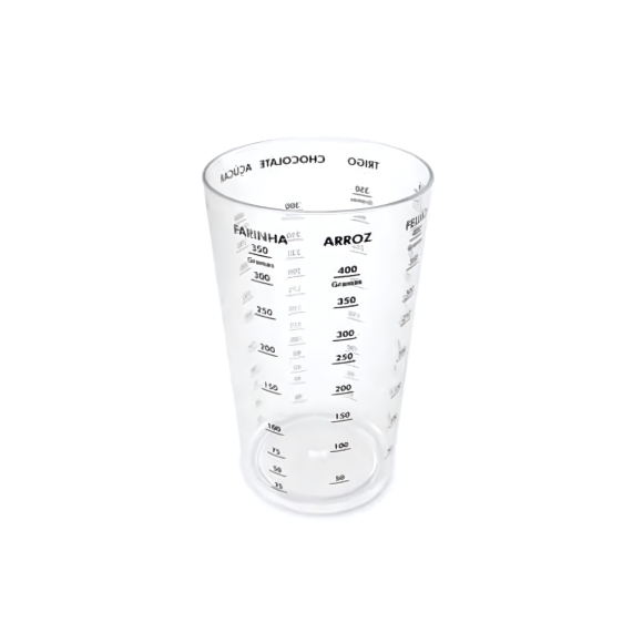 O copo contém medidas para arroz, farinha, açúcar, feijão e outros alimentos. Perfeito para preparo de bolos e pães.Esse medidor não pode faltar na sua cozinha!