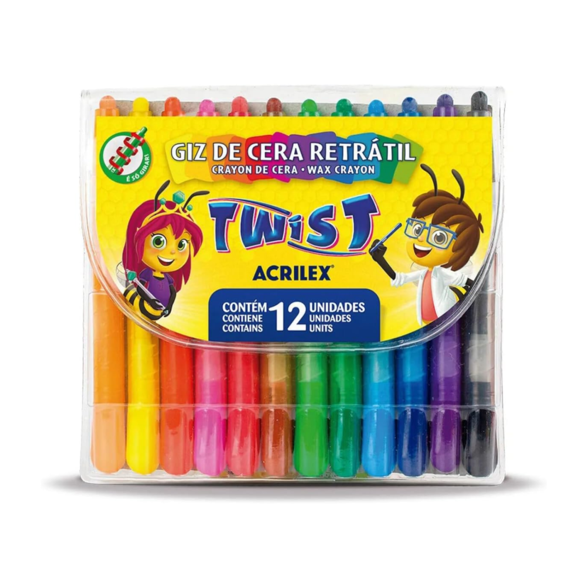 O Giz de Cera Retrátil Twist com 12 cores da Acrilex é uma opção prática e divertida para os primeiros passos no mundo da criatividade.
